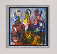 They are standing together literally,. but also figuratively. These three figures emerged out of the chaos of the expressionist painting, which I had sitting around for a few months. The blueish background effectively pushes them forward. You can imagine all kinds of things about their interaction.